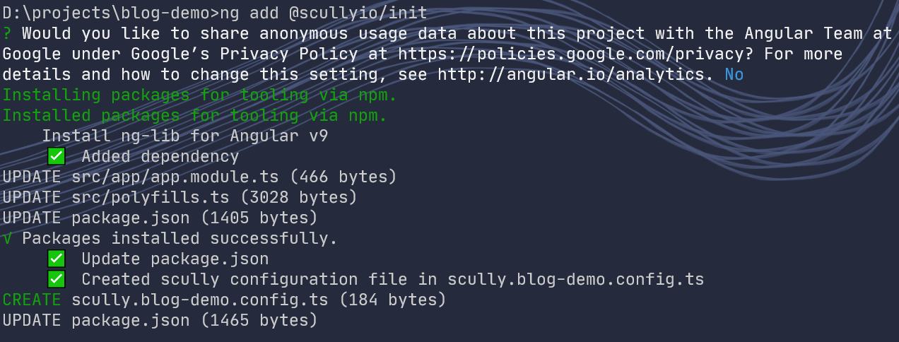 接著參考官方文件,輸入上方指令,將 Scully 加入 Angular 專案,並產生 scully.{your project}.config.ts。