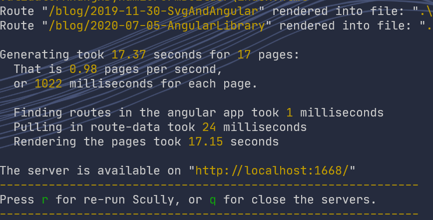npx scully --scan,當新增路由時,例如:新增一篇文章,需要執行這個指令,來找到新的路由。watch: