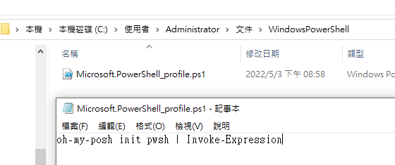 接下來輸入指令note $PROFILE,如下圖,在 Microsoft.PowerShell_profile.ps1 裡 加上指令 oh-my-posh init pwsh | Invoke-Expression。