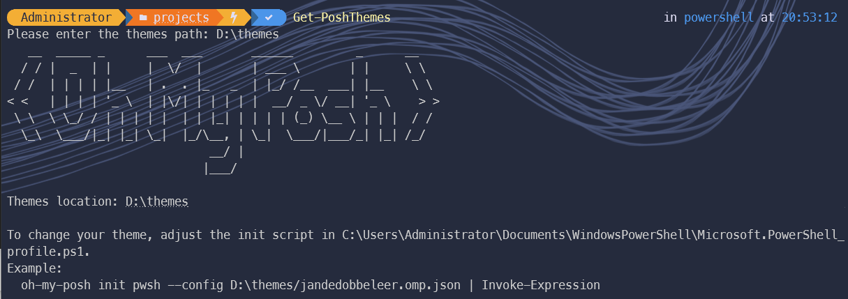 預設的主題比較單調,可以自定樣式或是戴入其他人建立好的主題,第一步輸入Get-PoshThemes 如果初次使用沒有指定目錄的話,會決定主題要存放的位置,不然會顯示目前已下戴的主題。