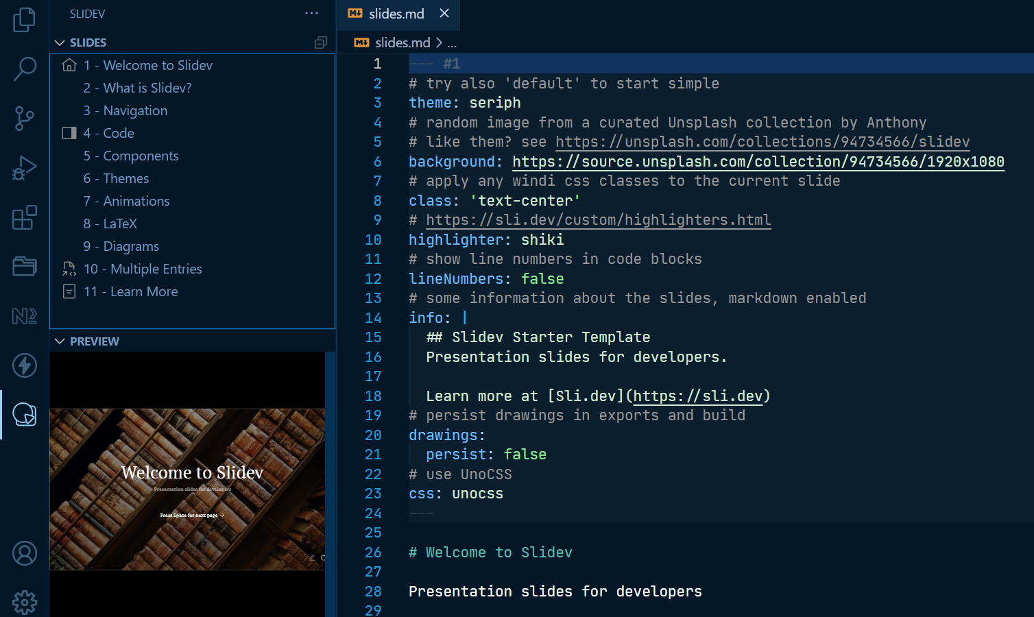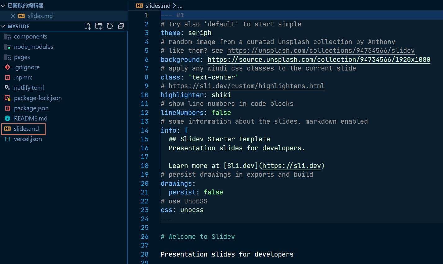 根據文件,進入點是 slides.md,一切的簡報這邊即可。