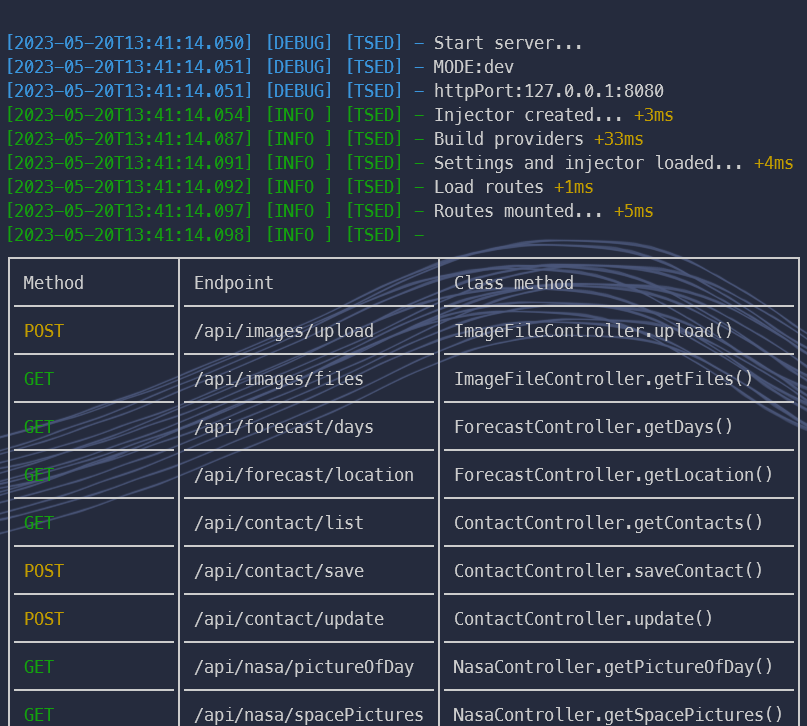 啟動很簡單的,只要執行index.js即可,而我習慣在本機開發階段是使用ts-node啟用,如此方便使用 VSCode 來 debug。並且站台啟用後,還可以看到輸出內容上顯示執行時間,及 api 列表,能一目了然目前狀態。