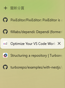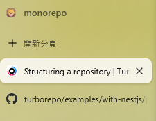 - Space — 這個功能讓你能將分頁分組,方便管理。舉例來說,最近我對 monorepo 很有興趣,便建立了一個 monorepo 的 Space,將所有與 Turborepo 相關的分頁都集中管理。此外,你還可以為每個 Space 設定不同的背景顏色。