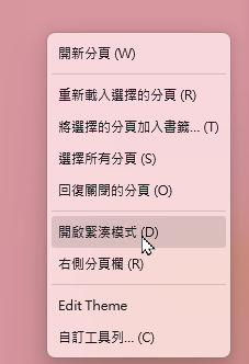 - 緊湊模式(Compact Mode) — 緊湊模式會預設隱藏側邊分頁欄,讓網頁以近乎全螢幕的方式呈現,提供更廣闊的視覺空間,特別適合閱讀文章或觀看影片。設定方法也很簡單,只需在分頁欄按右鍵選擇「開啟緊湊模式」即可。